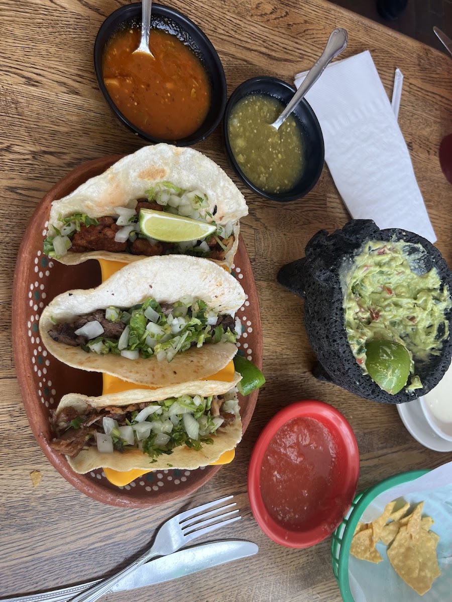 Phenomenal late lunch! Had the quesadilla trio (steak, chicken, shrimp) with sautéed peppers and onions and an Al pastor taco. My waiter Josie was so sweet, fast, and attentive. The homemade salsa verde is so delicious. I will be back again soon!